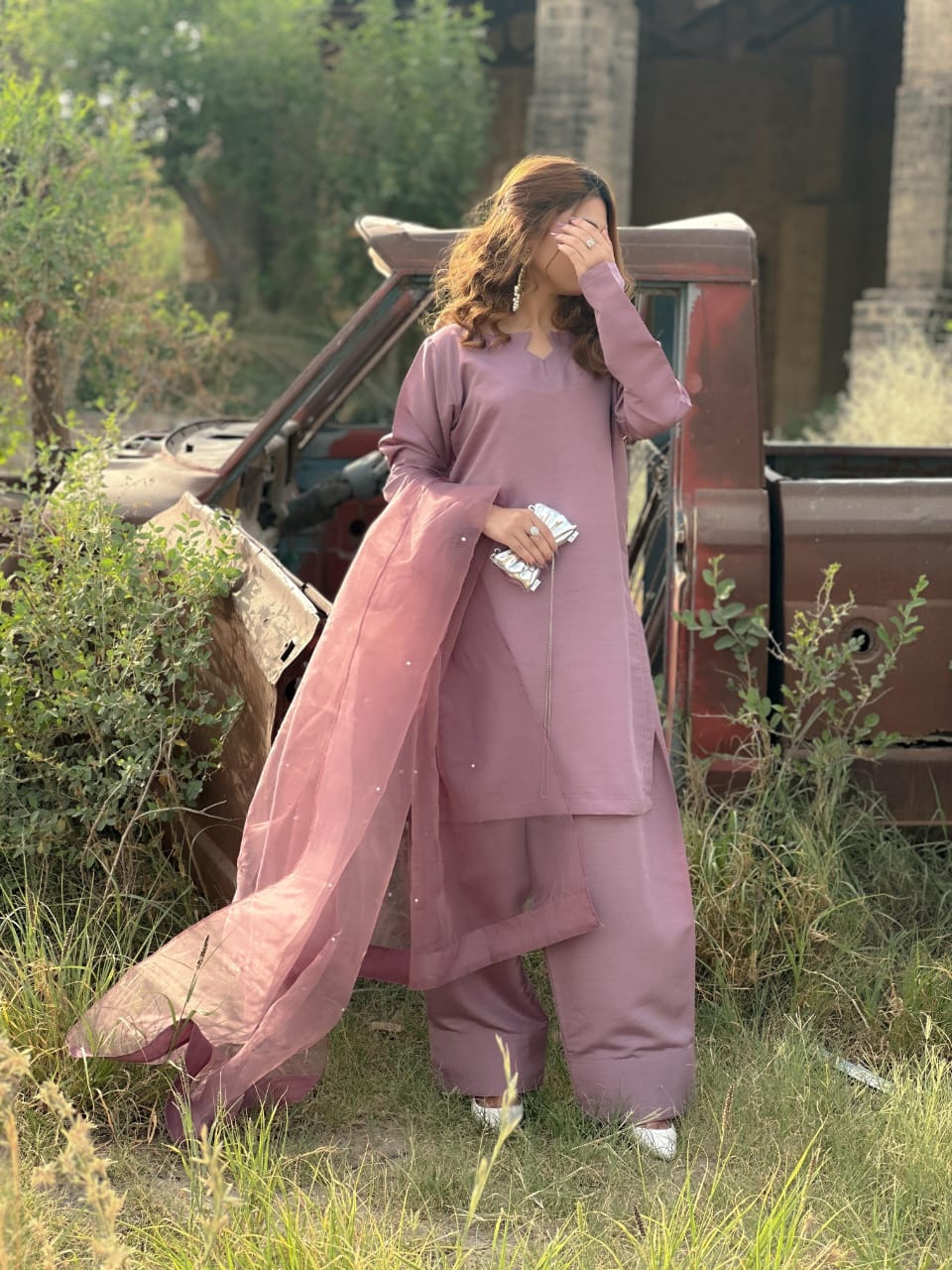 This outfit is designed to embody pure elegance and timeless charm. It features a stylish knee-length kurta, paired with a beautifully flowing farshi shalwar, and is completed with a delicate, sheer tissue dupatta — the perfect ensemble for a graceful and refined look.